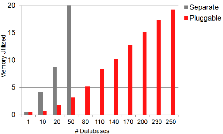 With the new pluggable DB structure, the SGA memory and background processes (of which there are now about 22 in release 12c) are shared across all member DBs of the mother container database (CDB). The pluggable databases (PDB) are defined to the CDB via an XML file which describes their structures and datafiles. Thus, the CDB stores metadata for each of it’s plugged-in databases in it’s master data dictionary. Each PDB has it’s own unique global identifier or GUID. Both UNDO and REDO areas are shared among PDBs. You can see how this would favorably impact DBA workload. All software upgrades, patches, and migrations could be applied once at the container database level. If desired, several container ‘levels’ can be designed at various release levels, and individual PDBs can be unplugged from one CDB and ‘migrated’ by plugging it into the next CDB.Lest you are wondering about the machine performance impact of all this new structure, Oracle claims their usual shattering test results (enlarge at right). A souped-up Oracle Sun server could handle about 50 identically configured databases before tapping out. But the same databases, after being converted to the pluggable architecture, allowed well over 250 to be simultaneously executing on the same box. 12c further centralizes the management of corporate databases; it will clearly realize cost savings for both hardware and DBA resources. In order to fully analyze the software cost impacts however, more information will be needed about Oracle’s licensing plans and pricing.