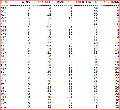 Two factors currently figure into the power factor: offensive points ranking and defensive points ranking. I favor these measures over more detailed things like yardage gained and allowed, as they seem to me to have a more direct effect upon winning. Two more will be added in coming weeks as the sample data fills out: margin ranking (offensive points minus defensive points), and a ranking based upon winning percentage within close games, as already mentioned. I like this last item as a kind of measure of playoff toughness. There is also a potential for attaching weighting coefficients to each component ranking factor in the future.