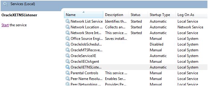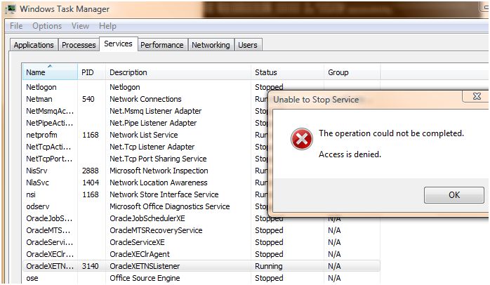 In the screenshot (above) you can see that these two services are ‘running’ as a result of the successful Start Database operation. All of this so far is default Windows XE installation behavior. Now, suppose you are done with Oracle work for awhile and want to shut it down. The Stop Database button will accomplish this for you, but a quick check of the Task Manager reveals that the TNS listener is still running afterwards. Absent a lsnrctl utility, Task Manager lets you manipulate individual Windows services by highlighting one and right-clicking. But look (left) what happens when you try to stop it. Even though we’re running as the Windows Administrator, we do not have sufficient access privileges for the TNS service. Instead, Windows forces you to click on the ‘Services…’ button at the bottom right corner of the panel which brings you to another (extended) view of the Windows Services while apparently conferring the necessary privileges. Here, you can finally stop the desired service, OracleXETNSListener.